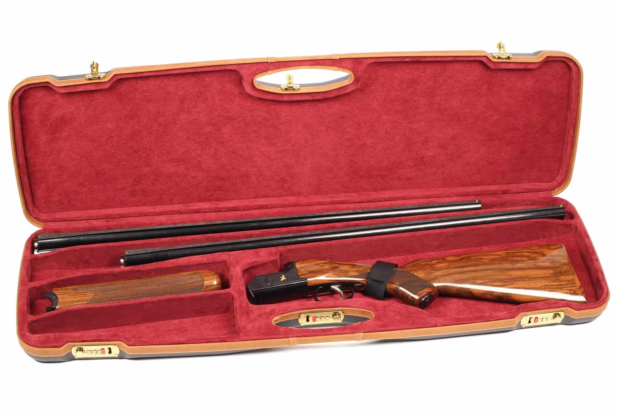 This Sporting model features a full Italian leather exterior and plush padded interior designed for high-end O/U shotguns with barrels up to 33.7″. Engineered for flat to mid-rib barrels with the forearm removed, and extra room for stocks with raised combs.