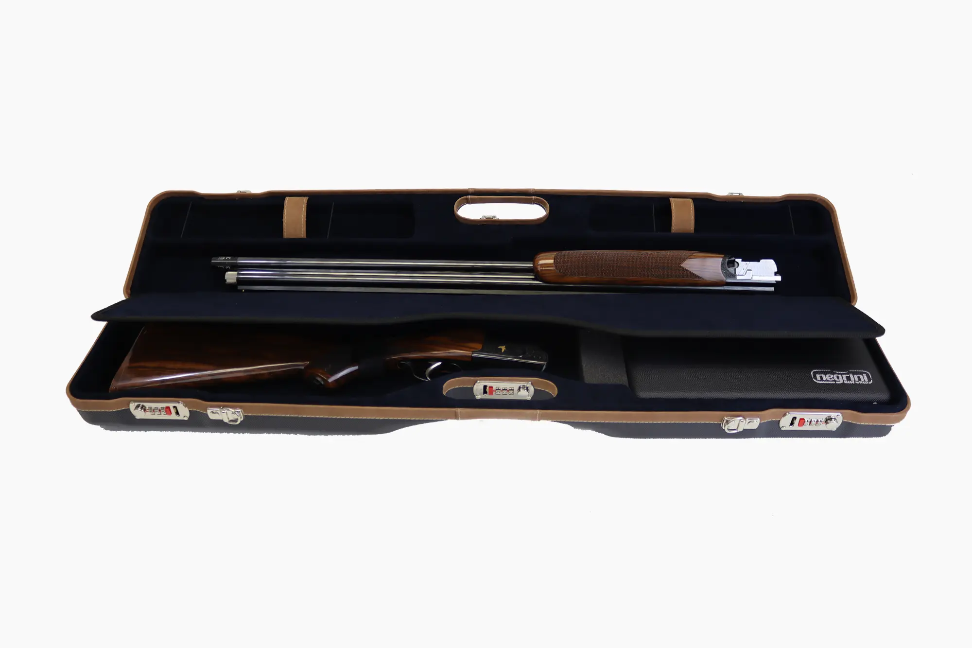 Negrini gun cases are designed with an ultra-strong double-wall ABS construction. Which consists of a thick thermoformed ABS outer case welded to a rigid thermoformed inner case. Negrini gun cases are fully cushioned and lined with plush velvet or microfiber. Negrini gun cases’ patented double wall construction assures maximum shock absorption without breaking. Each gun cases are fitted with hardened steel combination locks and hinges. The locks are recessed to prevent gun case damage on conveyor belts. Negrini gun case interiors are designed with separate compartments for stock and receiver, barrel and forend as well as accessories. All Negrini gun case materials used are certified to not outgas or corrode firearms. Many colors are available. Limited lifetime warranty.