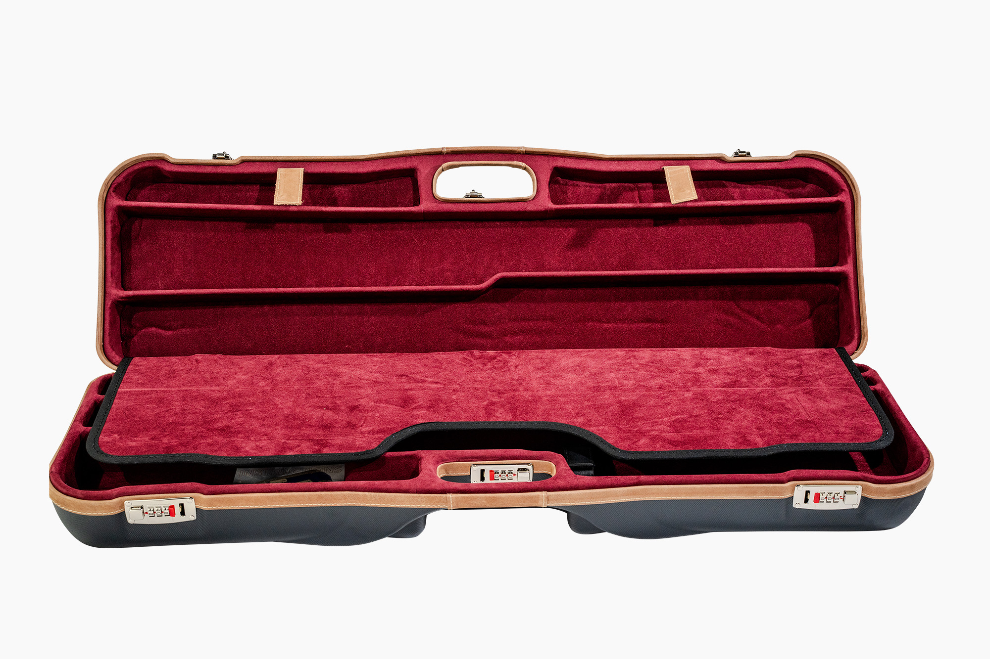 This competition-ready case is designed for a single O/U shotgun and two high-rib barrels. The bottom holds the stock, receiver, and accessories, while the top features a divider with space for two adjustable barrels. Trimmed in LX Italian leather for a premium finish.- Fits: O/U with two adjustable high rib barrels