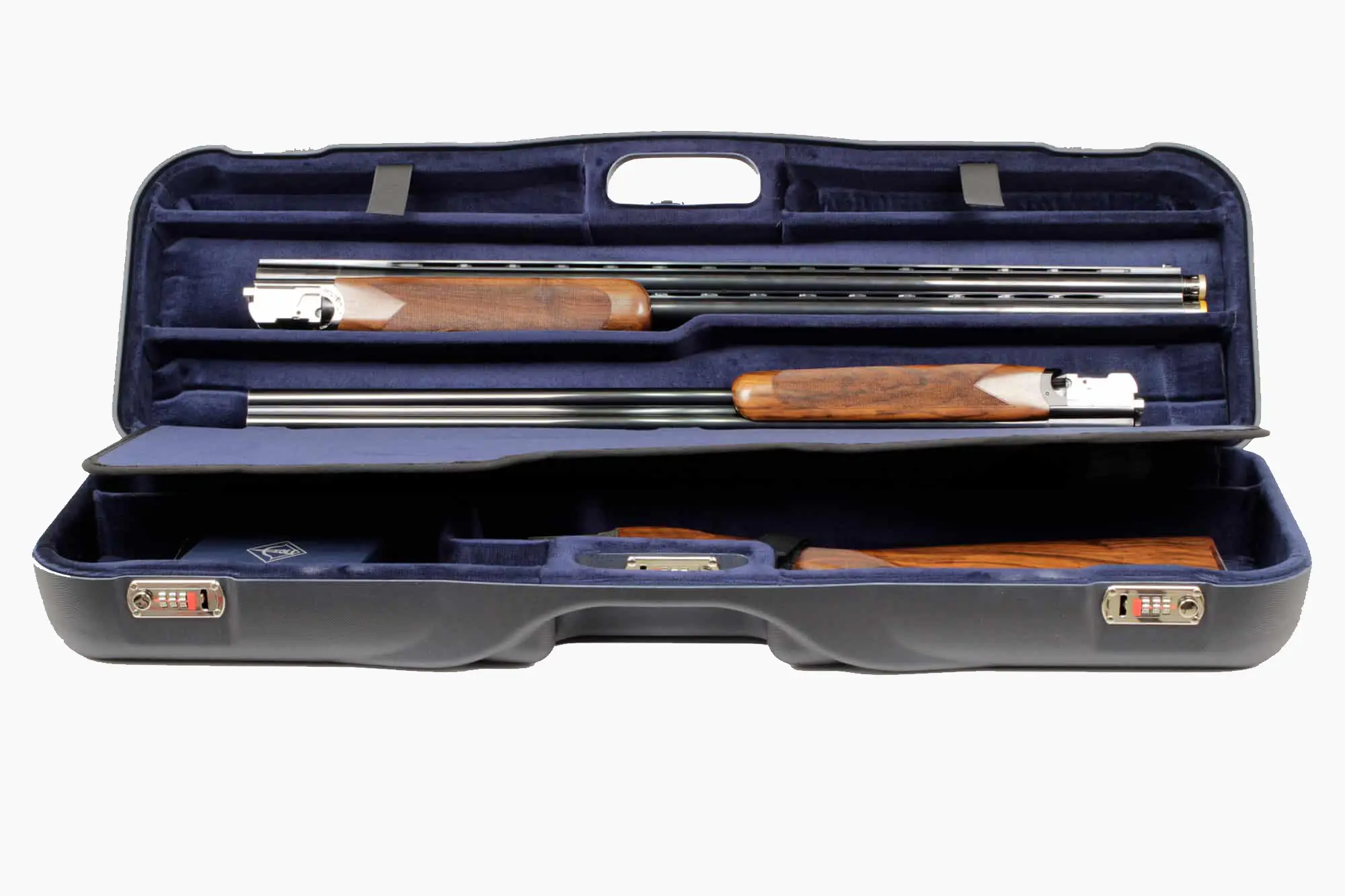 The 1646LR-2F+1C/4764 is the ultimate dual-gun case for shooters carrying two O/U or SxS shotguns with three total barrels. The lower level includes compartments for two barrels and two receivers, while a padded divider protects one extra barrel and accessories stored on top.- Fits: 2 guns + 3 barrels (max barrel length: 32″ + ext. chokes)
