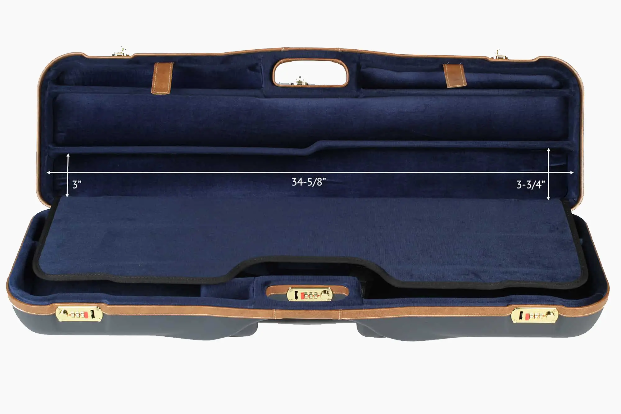 The 1646LX-2F+1C/4766 is designed to hold two Over/Under or Side-by-Side shotguns and three barrels. The base contains compartments for two barrels and receivers; the top includes a divider for one more barrel and gear. Built with deluxe leather trim and TSA-approved locks.- Fits: 2 guns + 3 barrels up to 34-5/8″